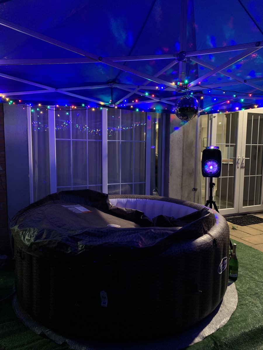 hot tub, 3x3 metre commercial grade wind and water proof gazebo with sides 12x12ft required, bottle of bubbly, fake grass, fairy lights, ice bucket, Disco lights, Bluetooth sound system.
